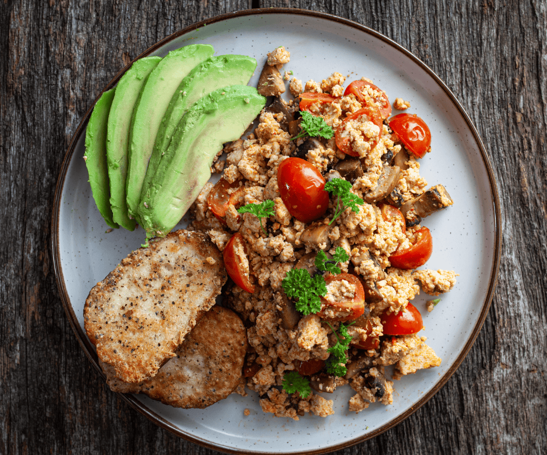 Asciuga il tofu con un panno da cucina, poi sbriciola il tofu con le mani fino a ottenere una consistenza simile a uova strapazzate.